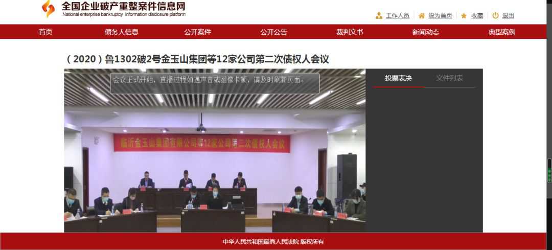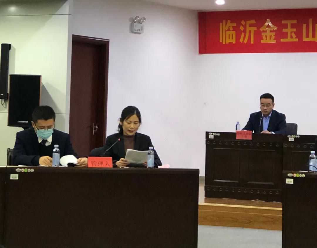 會議開始后,由臨沂市蘭山區人民法院合議庭書記員朱靜怡宣讀會場紀律,會議議程第一項:合議庭介紹案件進展情況;第二項:管理人代表尹昌鳳作《管理人履職工作報告》;第三項:審計機構代表李敏作《審計工作情況說明》;第四項:評估機構代表趙常鑫作《評估工作情況說明》;第五項:管理人代表孔鵬作《關于補充申報債權核查的報告》;第六項:管理人代表孔鵬公布《臨沂金玉山集團有限公司等十二家公司合并重整計劃(草案)》并進行介紹;第七項:管理人代表范昌龍宣讀《債權人會議表決規則》;第八項:合議庭宣讀臨時表決權決定書;第九項:山東省臨沂市沂蒙公證處宣讀第二次債權人會議線下表決結果公證情況;第十項:未表決的債權人進行線上表決并由管理人統計表決結果;第十一項:公布表決結果,本次會議上,全部債權組表決通過重整計劃草案。歷時一年,臨沂金玉山集團有限公司等十二家重整成功!